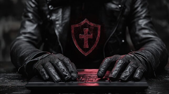 A person in black leather jacket and gloves typing on laptop with a red glowing shield with cross symbol in front of them.