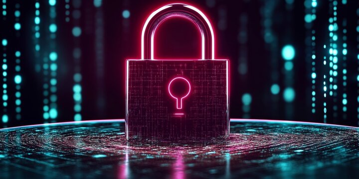 A digital lock with neon light effects representing cybersecurity and data protection.