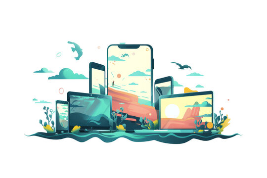 A wave of technological devices, such as smartphones and laptops, washing over a natural landscape.
