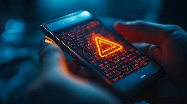 SMS spam, fake text message phishing from scammer cocept, System hacked red waning alert, email hack, scm malware spreading virus n message alert virtual onmobile phone screen in peron hand