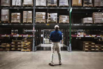 A man is exploring a digitally enhanced warehouse equipped with advanced inventory management systems