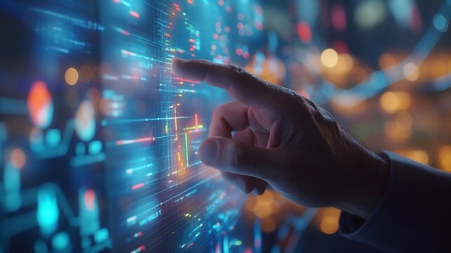 Digital Pioneer: Man Analyzes Data with Holographic Display, Pioneering Profitable Investment Strategies. A man's hand touches a technological touch screen.