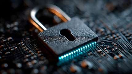 Digital padlock with glowing blue circuits on a futuristic cyberpunk background representing online security and data protection