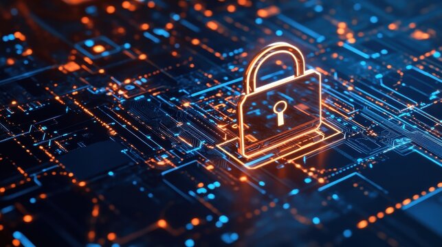 Glowing padlock icon on virtual circuit board for cybersecurity