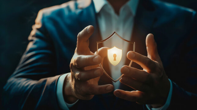 Close-up of a businessman's hands holding a padlock symbolizing confidentiality and data protection. Hands of a man in a suit with a digital lock on a dark background. Technology, privacy concept.