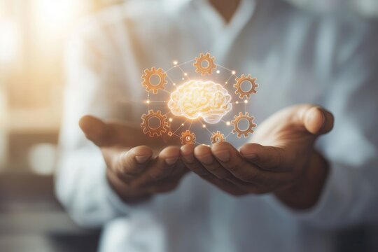 Person holds a holographic brain with gears, symbolizing AI or cognitive process