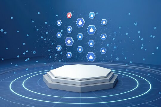 Futuristic digital design with glowing blue hexagons and rings