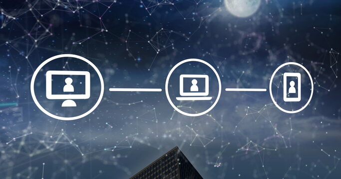 A complex three dimensional digital network interface featuring holographic user profile icons connected by lines and nodes conveying concepts of global communication and real time data exchange