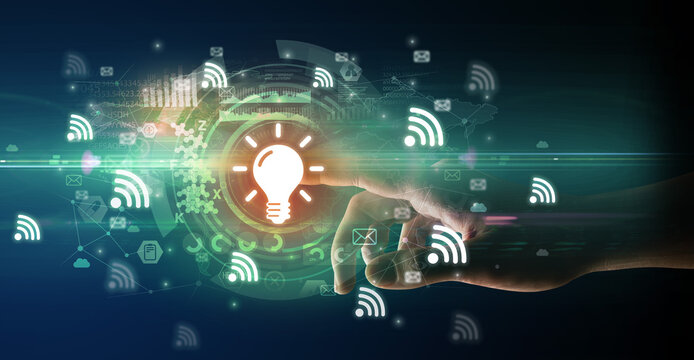 man Hand holding Light bulb Global Internet connection. Business global internet connection application technology and digital marketing, Financial and banking, Digital link tech, big data.