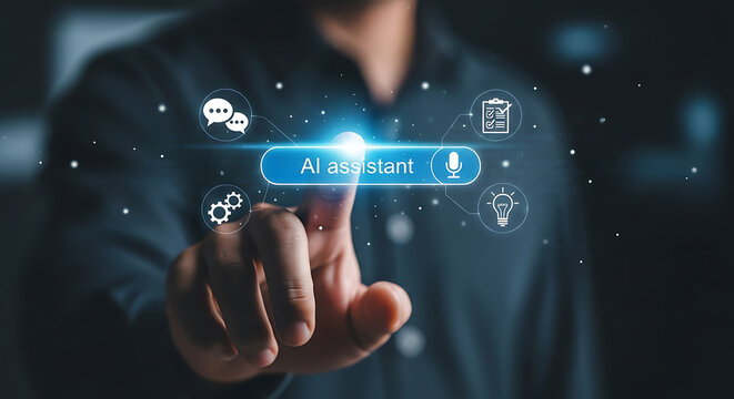 Person touching digital interface with A I assistant and icons AI assistant technology