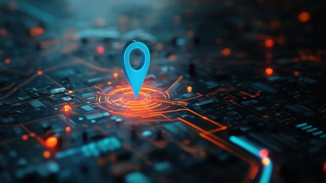 3D rendering of glowing location pin icon on digital city map with blue and orange lighting effects, surrounded by circuit patterns and abstract highway lines connecting urban structures. Concept of A