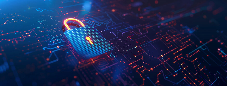 lock on blue background, Digital padlock for computing system on dark blue background, cyber security, Digital padlock for quantum computing system, cyber security technology, fraud prevention, Ai