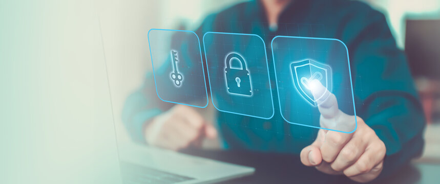 Businessman secures data with encryption and network security, protecting transactions. Cybersecurity for online business, data privacy, and defense against cyber attacks.