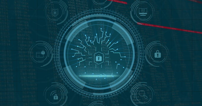 Image of fingerprint and padlocks over neon lights and data processing on black background