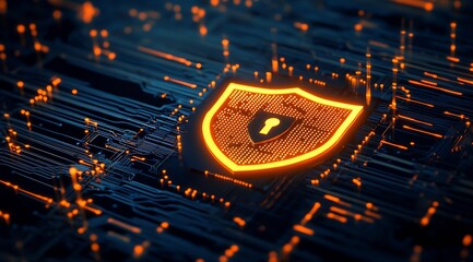 Cyber Fortress: A glowing shield with a padlock emblazoned upon it sits over a complex circuit board in an evocative representation of cyber security and digital protection.