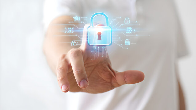 Data Privacy: A Hand Interacting with a Holographic Lock Icon over a Circuit Board.