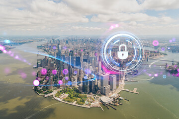 Cybersecurity concept over aerial view of New York City skyline with lock icon.
