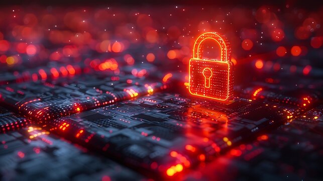 Futuristic digital padlock glows red on circuit board, symbolizing cybersecurity and data protection