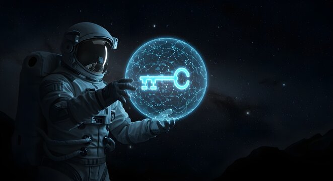 A high-tech astronaut manipulates a holographic lock interface, symbolizing cybersecurity and digital protection in a futuristic space setting, blending exploration with advanced technology.