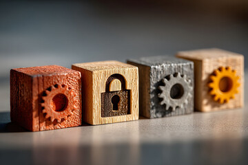 Security and Technology Concept with Gear and Lock Symbols on Wooden Blocks