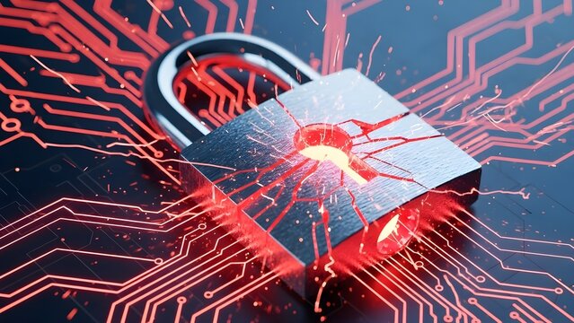 Glowing padlock overlaying intricate circuit board, symbolizing digital security