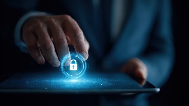 a businessman interacts with a futuristic tablet activating a digital lock symbol the image represents security innovation and the digital age in modern technology