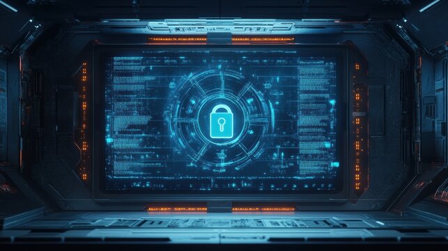 The screen shows a prominent lock icon surrounded by a digital interface, highlighting security in a high-tech setting. Generative AI