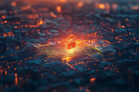 Digital city lock illustrating cybersecurity and data encryption
