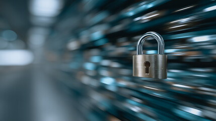 A close-up shot of a chrome lock hangs in front of a motion-blurred array of steel lockers, representing security and protection.