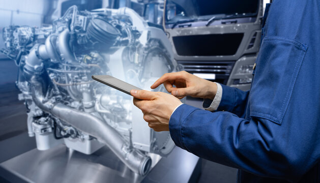 Serviceman with digital tablet on the background of  truck engine in the garage