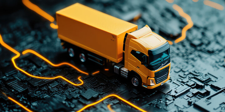 Miniature toy truck on digital map with neon route lines. Background for Logistics and transportation company