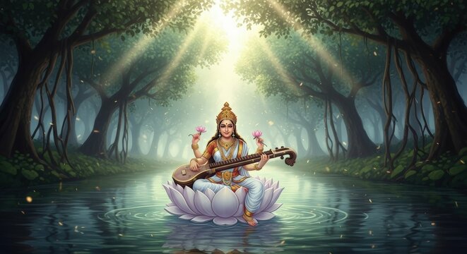 Ai generated image of goddess saraswati sits serenely on a lotus flower playing the veena in a tranquil forest