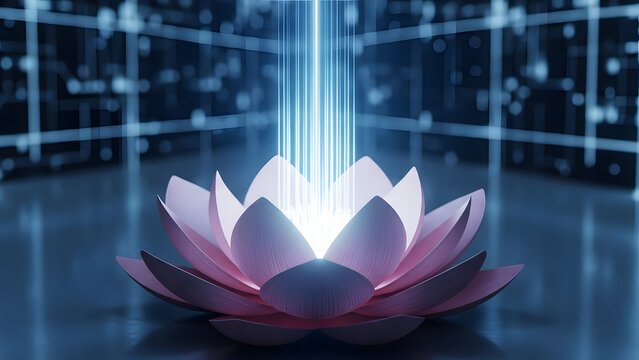 Glowing geometric lotus structure interacts with a polygonal yellow shape in dark digital space