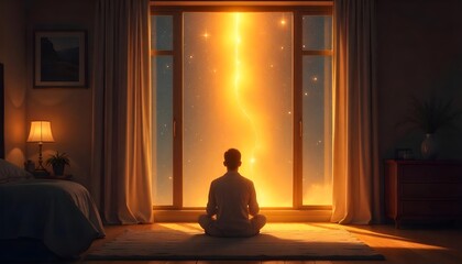 A highly realistic digital artwork of a serene bedroom at night, where a person sits peacefully on the floor in prayer during the sacred hours of 3 AM–5 AM