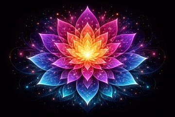 Vibrant fractal lotus flower blooming with colorful glowing particles