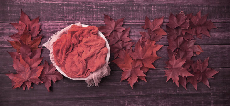 Newborn digital backdrop with handmade wreath of flowers and heart shaped basket. Newborn background. Top view. Flat lay.