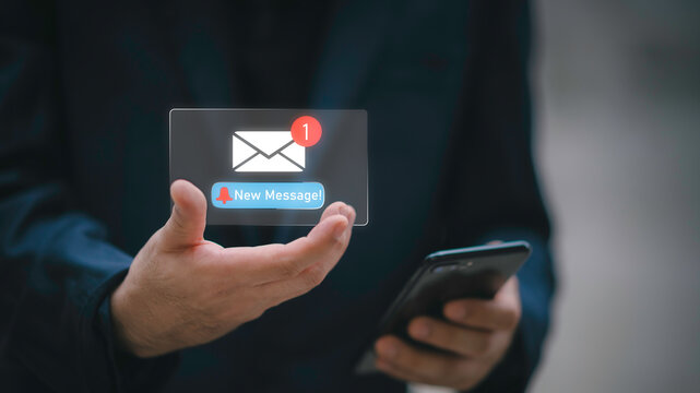 Businessman touching new message notification icon on virtual screen,email alert, online messaging system, representing digital communication, instant response, and business connectivity.