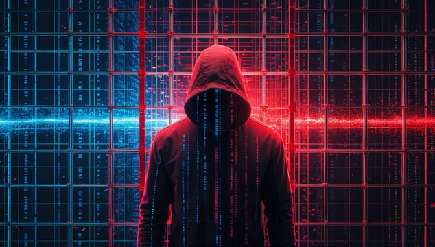 Hacker attack blocked by firewall grid with red and blue data particles, cyber defense concept