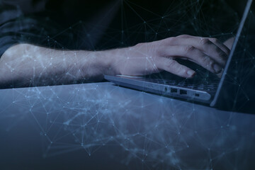 Hands at laptop with interconnectivity graphic overlay along with the word 'CAUTION' displayed large