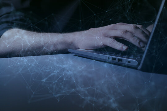 Digital Hacker Concept Mysterious Hooded Figure with Code Overlay Working on Laptop in Dark Secretive Setting - Technology Security Cinematic Scene