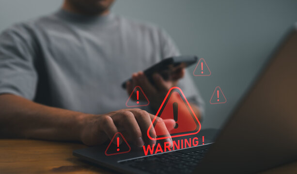 Businessman or it staff , programmer, developer using computer laptop with triangle caution warning sign for notification error and maintenance concept