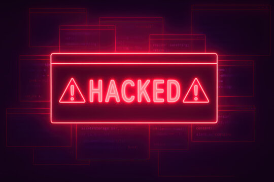 System warning hacked alert, cyberattack on computer network. Cybersecurity vulnerability, data breach, illegal connection, compromised information concept. Malicious software, virus and cybercrime.