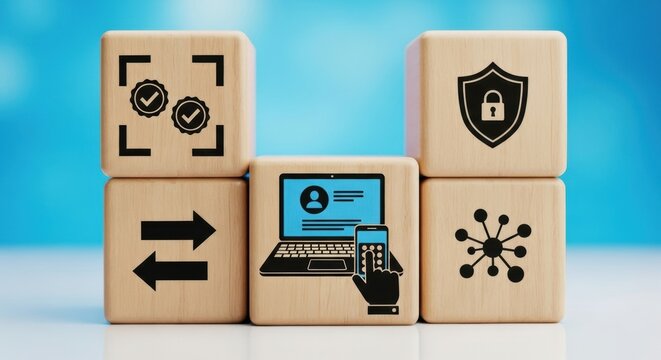 Wooden blocks with icons representing data security, network transfer, user login, and digital protection against cyber threats