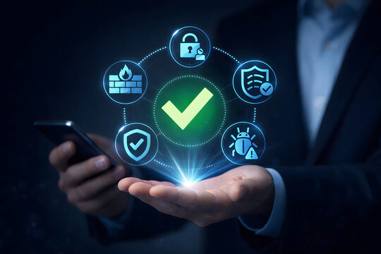 A person using a smartphone and laptop with a red warning alert icon, representing cybersecurity threat, malware attack, phishing, or data breach risk in the digital environment.