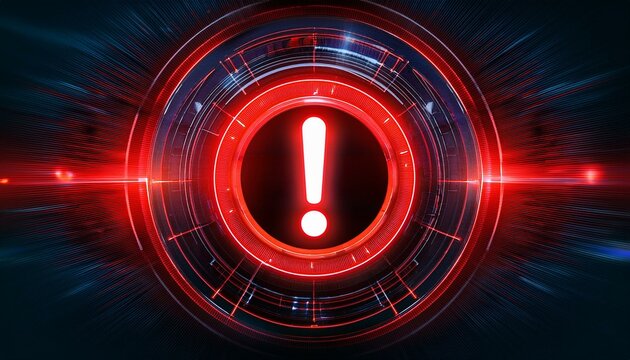 Cybersecurity Warning Alert System:  A digital warning sign with a bright red exclamation mark at the center of a futuristic technological interface.