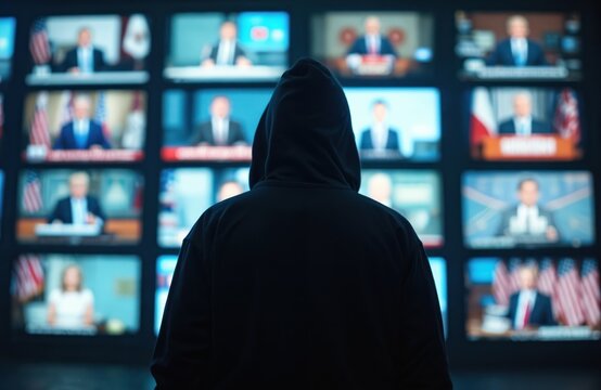 Hands holding smartphone showing deepfake with warning signs about misinformation and technology abuse in a digital environment