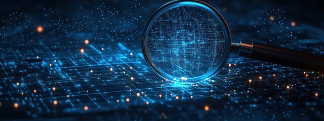magnifying glass inspecting a glowing blue digital grid with circuitry and orange data nodes, evoking focused analysis and futuristic discovery