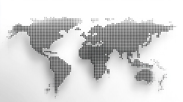 Abstract halftone dots form a world map, symbolizing global connectivity, digital communication, data visualization, and modern technology in a visually striking and conceptual background.