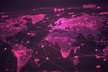 A digital map of the world with glowing lines connecting various points, representing global connectivity