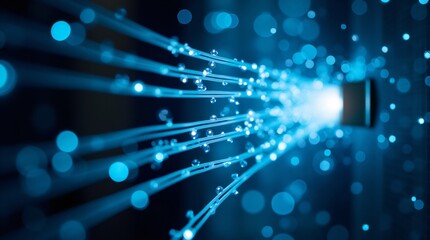 Technology data transmission. Blue glowing fiber optic cables transmitting digital data with light streaks and bokeh effect for technology background. Network connection concept